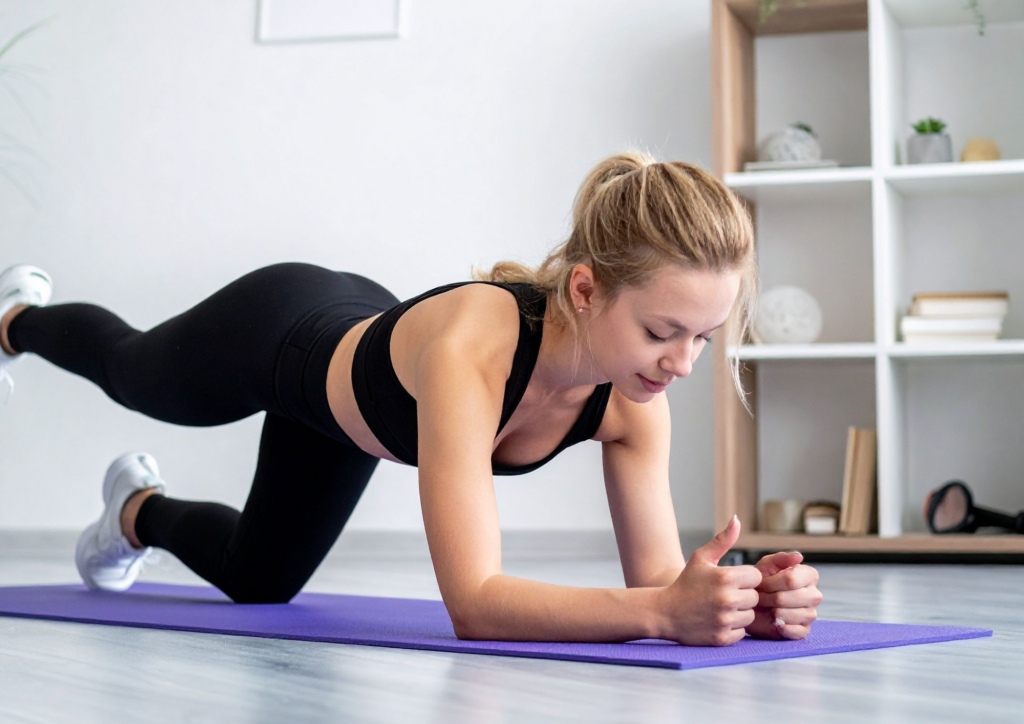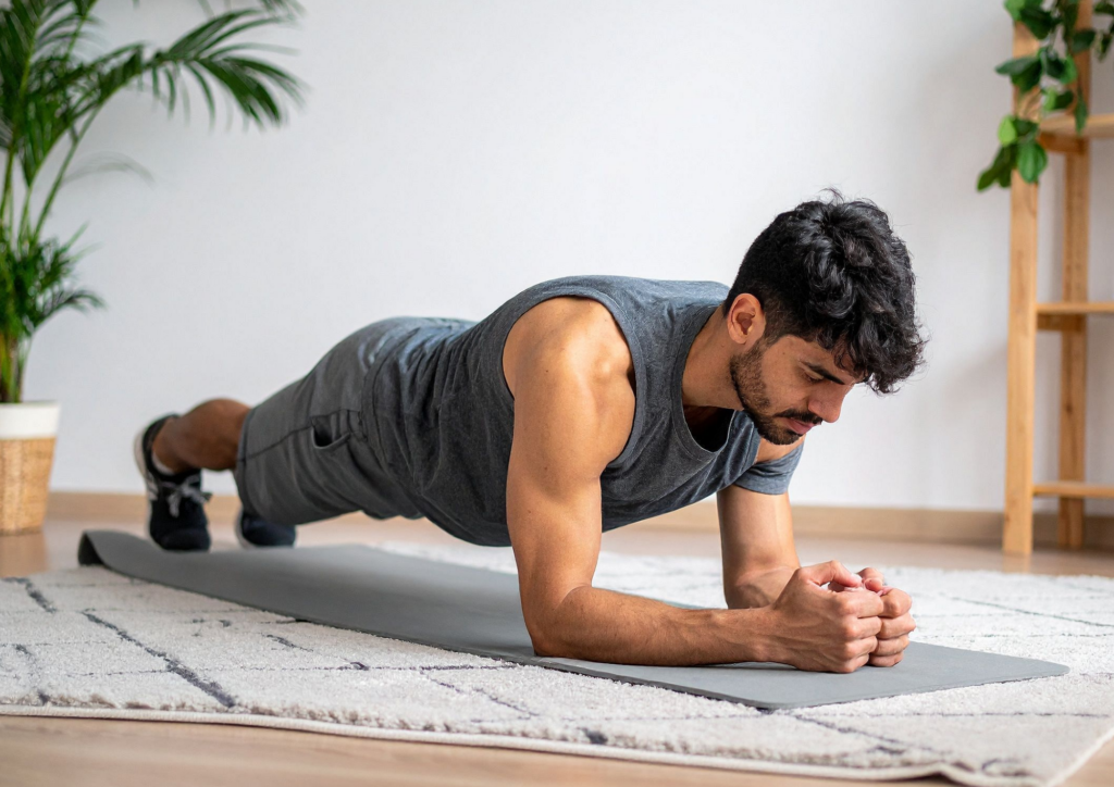 - Mountain climbers: Ejercicio dinámico que trabaja abdomen, hombros y piernas mientras aumenta la resistencia cardiovascular.
